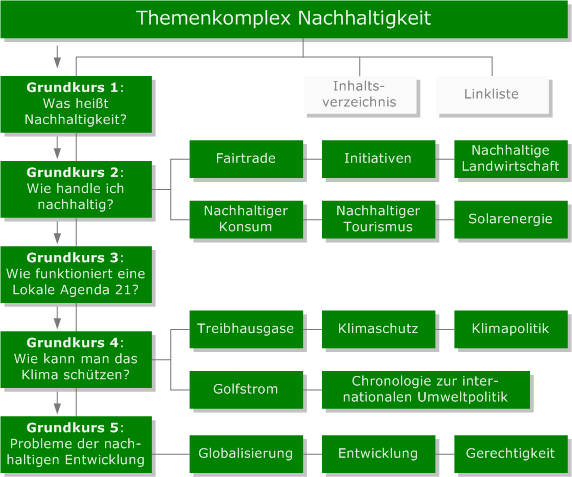 Der Themenkomplex Nachhaltigkeit im Überblick Durch Klicken auf die Kästen gelangen Sie direkt zur entsprechenden Seite. Ein schriftliches Inhaltsverzeichnis finden Sie auf der Seite Inhalt.