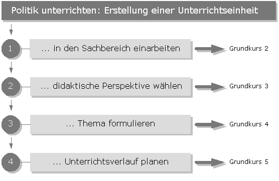 Politik unterrichten ist schwierig. Mehr noch als in anderen Fächern geht es im Politikunterricht um mehr als die Vermittlung von Grundwissen. Der folgende Grundkurs besteht aus fünf Sequenzen und versucht, möglichst praxisnah die Schritte bei der Erstellung einer Unterrichtseinheit im Fach Politik darzustellen. Er will Lehrerinnen und Lehrern eine Hilfestellung bieten. Das Schaubild veranschaulicht die vier Schritte, die bei der Erstellung einer Unterrichtseinheit aufeinanderfolgen und die Thema der folgenden Grundkurse sind:
