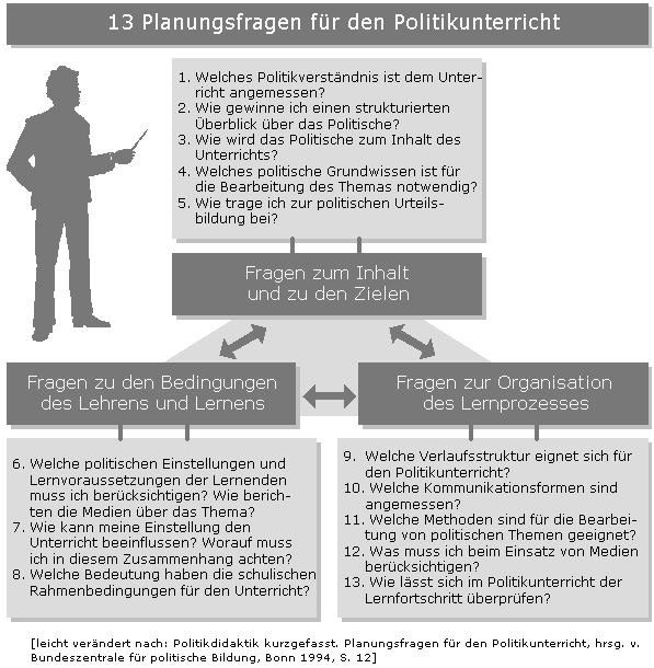 "Diese Fragen beziehen sich auf die konkreten Ziele des Politikunterrichts und ihre Legitimation, auf die Lerninhalte und die Begründung ihrer Auswahl, auf die gesellschaftlichen, institutionellen und individuellen Lernvoraussetzungen sowie auf die Organisation des Lernprozesses, das heißt auf die Auswahl der Methoden und Medien, der Arbeits- und Interaktionsformen. Die Planungsentscheidungen, die Lehrerinnen und Lehrer immer wieder treffen müssen, liegen also auf unterschiedlichen Ebenen, sind jedoch eng miteinander verknüpft und bedingen sich gegenseitig. Sie beziehen Erkenntnisse der politikdidaktischen Diskussion ebenso mit ein wie Ergebnisse der Politikwissenschaft und anderer Sozialwissenschaften. Der folgende Fragenkatalog darf nicht als Rezept für die Unterrichtsplanung missverstanden werden. Trotz aller Zutaten steht am Ende keine fertige Unterrichtseinheit und auch der Unterrichtserfolg ist nicht garantiert. Die Fragen sind vielmehr ein Suchinstrument, mit dessen Hilfe Lehrerinnen und Lehrer während der Planung überprüfen können, ob sie wichtige Überlegungen ausgespart haben oder ob zentrale Aspekte nicht ausreichend bedacht und berücksichtigt worden sind. Der Fragenkatalog ist auch keineswegs vollständig, und seine Grundlage ist nicht eine systematische fachdidaktische oder fachwissenschaftliche Theorie oder Konzeption, sondern es sind die Probleme der Unterrichtspraxis selbst, die zu diesen Fragen geführt haben. (...) Die Fragen wurden drei verschiedenen Ebenen der Unterrichtsplanung zugeordnet und so weit wie möglich in eine logische Struktur gebracht. Daraus könnte leicht der Eindruck entstehen, Unterrichtsplanung sei ein additiver Vorgang und die Fragen enthielten eine bestimmte Abfolge, die bei der Bearbeitung einzuhalten sei. Dies wäre ein falscher Eindruck, und er würde ein wichtiges Merkmal von Unterrichtsplanung außer acht lassen. Unterrichtsplanung ist nämlich kein linearer, sondern ein zirkulärer Denkprozess. Dies bedeutet zweierlei: Zum einen ist der Beginn des Planungsprozesses nicht festgelegt. Lehrer/innen können praktisch mit jeder Frage in die Planung einsteigen, müssen jedoch im Verlauf ihrer Überlegungen alle Fragen reflektieren und Entscheidungen dazu treffen. Zum anderen stehen alle Planungsfragen in einer engen Beziehung zueinander. Das heißt, die Entscheidung zu einer Frage hat Auswirkungen auf alle anderen Entscheidungen. Notwendig ist eine ständige Abstimmung und Korrektur so lange bis alle Planungsentscheidungen zueinander passen." [Politikdidaktik kurzgefasst. Planungsfragen für den Politikunterricht, hrsg. v. Bundeszentrale für politische Bildung, Schriftenreihe Bd. 326, Bonn 1994; S. 9-11] |