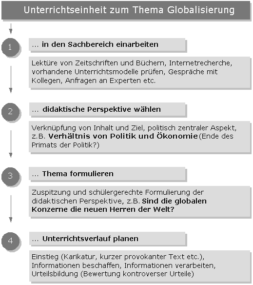 Im dritten Schritt wird das Thema formuliert - als Zuspitzung und schülergerechte Formulierung der gewählten didaktischen Perspektive, mit der es übereinstimmen muss. Das Thema muss problemorientiert und offen sein, häufig wird es in Form einer Frage oder einer Gegenüberstellung von These und Antithese formuliert. Im Rahmen dieser Zielsetzung soll es nach Möglichkeit motivieren, Interesse wecken oder provozieren. Die Planung der Unterrichtsverlaufs bildet den vierten und letzten Schritt des hier vorgeschlagenen Rasters. Hier gilt es in besonderem Maße, die Planungsfragen zu berücksichtigen, die wir in Form eines Schaubilds auf einer gesonderten Seite dargestellt haben (siehe Schaubild "Planungsfragen"). Das folgende Schaubild veranschaulicht die vier Schritte anhand des Beispiels einer Unterrichtseinheit zum Thema Globalisierung: