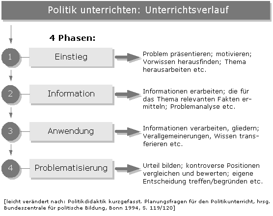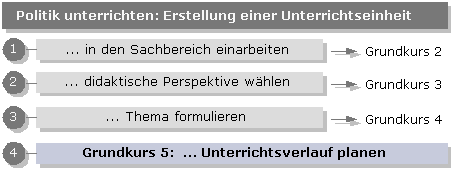 Zusammenfassung: Erstellung einer Unterrichtseinheit Zum Abschluss des Grundkurses wollen wir die wichtigsten Aspekte zusammenfassen, die es bei der Erstellung einer Unterrichtseinheit im Fach Politik zu berücksichtigen gilt. Wir haben ein 4-teiliges Raster vorgeschlagen, das mit der Einarbeitung in den Sachbereich beginnt. Hier kann ein Analyseschema hilfreich sein, das Schlüsselfragen entlang der drei Politikdimensionen formuliert (siehe "Checkliste" in Grundkurs 2). Die sorgfältige Einarbeitung bildet die conditio sine qua non für erfolgreichen Politikunterricht. Im zweiten Schritt geht es darum, eine didaktische Perspektive zu wählen. Das kann nur sinnvoll geschehen, wenn man den Sachbereich inhaltlich durchdrungen hat. Nur dann wird man in der Lage sein, aus der Fülle des Stoffs die Perspektive zu destillieren, die den Sachbereich für die Schüler aufschließt. Die didaktische Perspektive bildet die Verknüpfung von Inhalt und Ziel - sie bildet die Antwort auf die beiden Fragen: Was will ich bei den Schülerinnen erreichen? Wo setze ich den inhaltlichen Schwerpunkt? Bei der Wahl der didaktischen Perspektive müssen folgende Punkte beachtet werden: