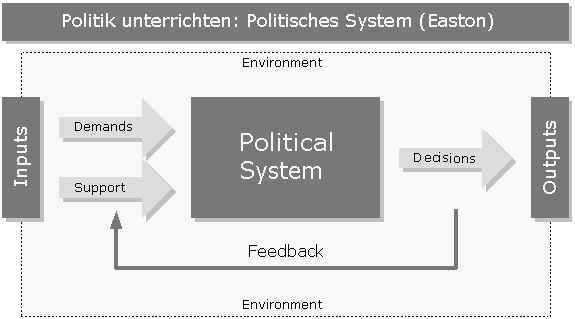 Nach dieser Vorstellung werden aus der Umwelt Forderungen (demands), Erwartungen und Unterstützung (support) an das politische System herangetragen, die im sogenannten "Conversion-Prozess" innerhalb dieses politischen Systems verarbeitet werden und dann zu für alle Mitglieder einer Gesellschaft verbindlichen Entscheidungen im Form von Gesetzen und Verordnungen führen. Diese führen über Reaktionen innerhalb der Gesellschaft zu einem feedback und damit erneut zu demands und/oder support. [Autoren: Ragnar Müller, Prof. Dr. Wolfgang Schumann] |